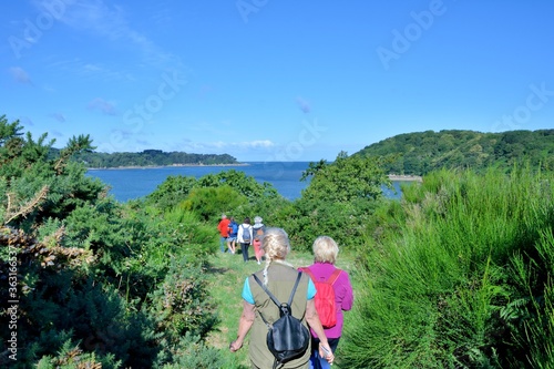 senior, hiking, landscape, sea, hiker, path, nature, hike, walk, group, brittany, people, walking, retired, pension, travel, holiday maker, trekking, adventure, woman, sky, backpack, summer, rock, trail, view, blue, sport, seascape, background, mature, old