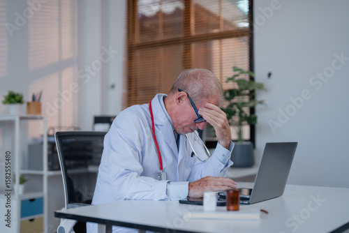 doctor, stress, cephalalgia, laptop, medicals, office, burnout, health care, medicine, sleepy, overworked, exhausted, senior, male, professional, work, computer, desk, health, clinic, hospital, workplace, pressure, fatigue, mental, problem, worried, frustrated, depression, anxiety, disease, pain, migraine, tension, unhappy, technology, sitting, goggles, stethoscope, medication