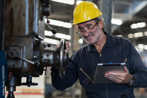 Senior male engineer worker working and inspecting parts quality of lathe machine in industry factory, wearing safety uniform, helmet. Mature male technician worker maintenance parts of machine