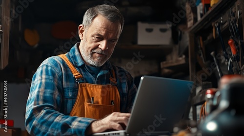 Senior male mechanic using a laptop in the workshop. Old repairman using a laptop in his garage