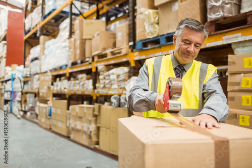 Senior male warehouse worker in safety vest taping box with tape dispenser in aisle, copy space