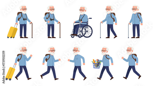 senior, man, elderly, old, male, grandfather, grandfather, character, illustration, vector, cartoon, flat, people, person, adult, grey hair, goggles, beard, active, lifestyle, activity, pose, set, collection, diverse, travel, tour tourism, vacation, baggage, suitcase, yellow, walking stick, cane, assistance, disability, wheelchair, health, mobility, running, jogging, walking, shopping, grocery, basket, food, healthy, exercise, hobby