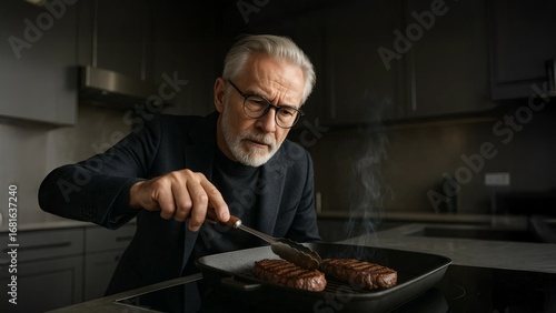 steak, grill, senior, kitchen, food, meal, chef, lifestyle, culinary, home cooking, gourmet food, tongs, cooking, frying, hot, smoke, meat, preparation, dinner, lunch, domestic, kitchen utensile, beef, mature, serious, professional, nourishment, indoor, sharpened, goggles, receipe, frying pan, healthy eating, grey hair, home interior, food preparation, concentrated