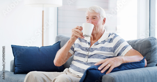 Senior man, drink coffee and and watching tv on sofa, streaming and relax with news in retirement. Elderly person, smile and tea cup with show, media and television in living room at nursing home