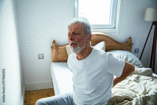 senior, man, pain, bedchamber, people, health, home, lifestyle, morning, discomfort, mature, male, elderly, sitting, bed, beard, expression, emotion, indoor, casual attire, resting, health care, ageing, wellness, problem, suffering, ache, posture, sleepy, stress, fatigue, white hair, morning light, filtered, seniority, domestic, lifestyle, copy space