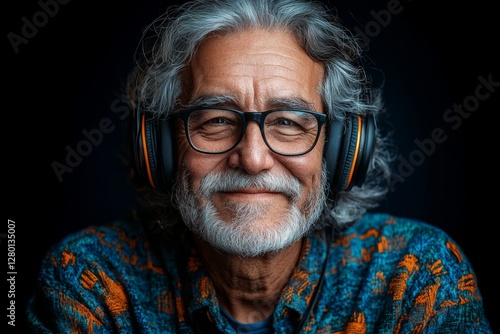 elderly, man, earphones, goggles, smiling, joyful, portrait, beard, happiness, cheerful, senior, studio, black, background, elder, stylish, closeup, male, expressive, modern, lifestyle, wrinkle, face, positive, listening, music, thoughtful, mature, cosy, confident