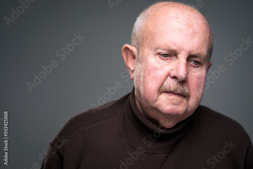 Senior man lonely at home, anxious/afraid to go out - self isolation/ quarantine due to COVID-19/ Coronavirus social distancing/prevention concept