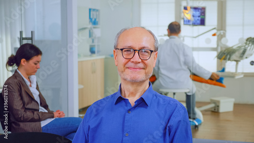 Senior man looking at camera while doctor examining patient in background. Elderly male smiling on webcam sitting on chair in waiting room of stomatological clinic, assistant typing on pc