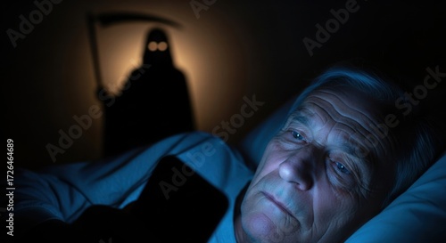 senior, man, phone, death, grim, reaper, shadow, addiction, digital, adult, elderly, old, face, sleep, bed, problem, issue, fear, dark, night, light, alone, sad, cyberspace, social, media, technology, mobile, insomnia, health, danger, serious, care, life, end, time, stress, anxiety, habit, device, screen, future, global, person, male, caucasian, grieved, despair