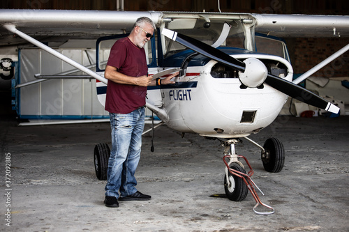 Senior man pilot checking ultralight airplane before flight