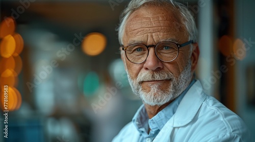 Senior man with glasses and white lab coat standing in front of blurry background doing scientific research work