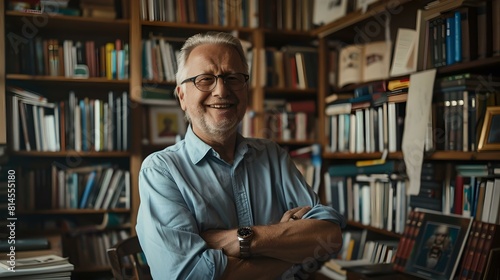 Senior scholar smiling in a library full of books, radiating knowledge and wisdom