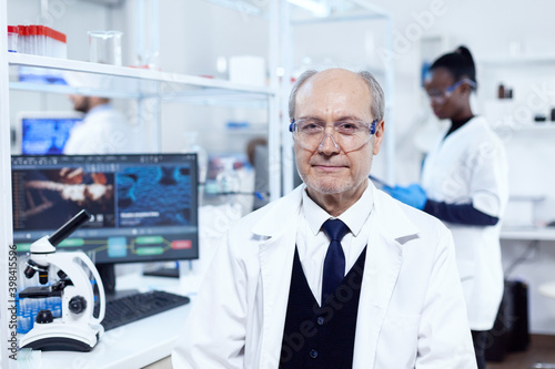 Senior scientist sitting at his workplace during medical experiments. Elderly scientist wearing lab coat working to develop a new medical vacine with african assistant in the background.