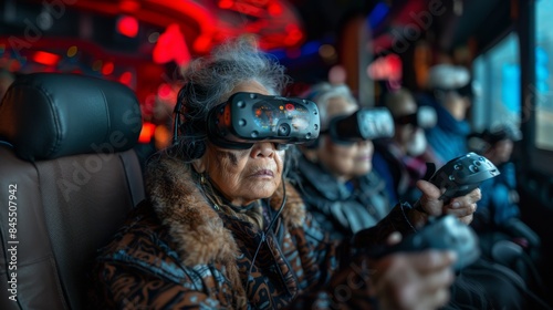 asian, senior, female, woman, headset, elderly, technology, life events, immersed, engaging, enjoying, futuristic, interactive, innovation, goggles, gaming, simulation, digital, trend, leisure, activity, fun, modern, entertainment, transport, bus, travel, future, exciting, adventure, journey, place, destination, transportation