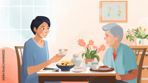Senior woman sitting and enjoying breakfast with nurse in retirement home illustration
