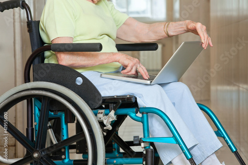 adult, casual attire, citizen, communication, corridor, disability, disabled, elder, elderly, female, handicap, health care, horizontal, hospital, injury, laptop, man, midsection, mobility, old, older, 1, pension, pensioner, people, person, physical, portability, rehab, rehabilitation, retired, retirement, senior, sitting, technology, therapy, typing, wheelchair, wireless, woman