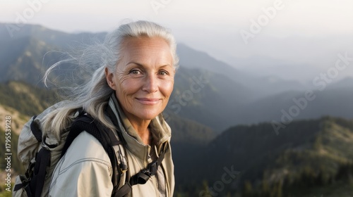 Senior woman smiling on mountain enjoying active lifestyle, hiking adventure, and healthy travel