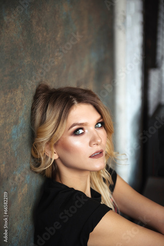 Sensual close-up portrait of young pretty blond woman on gray background. Fashion and style concept. Photo in studio. Woman posing at camera