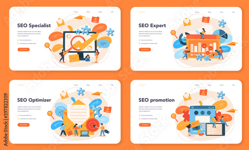 SEO optimizer web banner or landing page set. Idea of search engine optimization