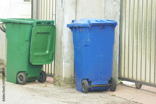 Separation of garbage in the household and collection of waste in individual garbage containers: close-up photo of green and blue plastic bins on wheels installed near the fence of the house