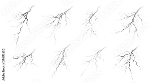 Sequence of Powerful Lightning Bolts Striking Isolated on White Background Electric Storm Energy, Thunderbolt Flash, and Natural Phenomenon