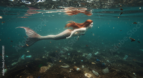 siren, sea, rio, lagoon, water, subaquatic, ocean, dunk, trash, pollutant, plastic, recycling, liability, caring, filth, clear, ocean, nature, sanitization, plunge, life, deep, fish, aquatic, school, swimming