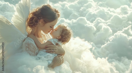 Serene Angelic Figure with Child in Ethereal Clouds