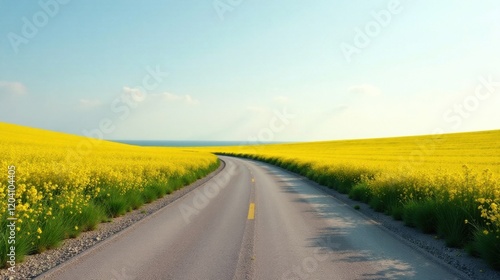 road, asphalt, path, curve, yellow, flower, blossom, field, meadow, countryside, rural, scenic, landscape, nature, summer, sunshine, horizon, sky, tranquil, peaceful, beauty, vibrant