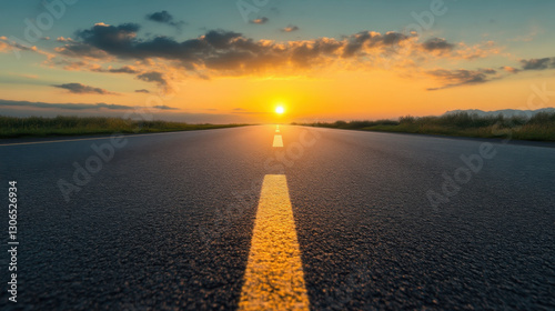 serene asphalt road stretches towards vibrant sunset, symbolizing goals and plans for future. warm colors of sky create peaceful atmosphere