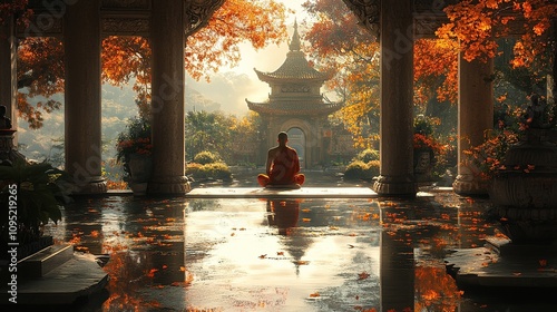 Serene Autumn Meditation: A Monk Contemplates in a Tranquil Asian Temple Garden