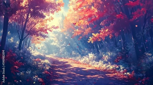 Serene autumn pathway with vibrant red and orange foliage.