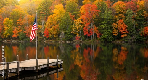 Serene autumn reflection on lake with united states flag on dock, calm water mirroring colorful foliage for travel, scenic beauty and patriotic landscape.