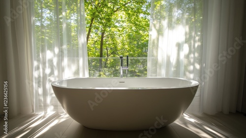 bathtub, bathroom, freestanding, tub, modern, luxury, spa, relaxation, serene, calmness, greenery, tree, leaf, window, curtain, light, sunlight, natural, peaceful, calm, bright, white, clean, minimalist, interior, design, home, decor, style, elegant, sophisticated, wellness, comfort, sanctuary, escape, refresh, rejuvenate, oasis, view, nature