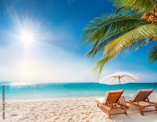 Serene Beach Scene With Palm Tree and Sun Loungers on a Sunny Day