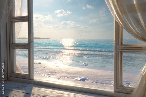 beach, ocean, sea, window, sun, light, sand, wave, sky, cloud, curtain, coastal, serene, peaceful, tranquil, calm, idylli, romantic, view, landscape, seascape, white, wood, frame, texture, natural, beauty, art, photo, image, picture, aesthetic, home, decor, interior, design, print, canvas, sale, artwork, premium