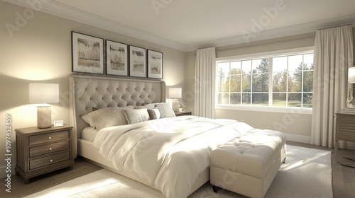 bedchamber, serene, design, neutral, tone, natural, light, sunlit, window, curtain, bed, headboard, tufted, upholster, beige, cream, pillow, blanket, bedding, comfort, cosy, relaxing, calm, peaceful, quiet, tranquil, restful, elegant, sophisticated, luxurious, style, decor, interior, home, furniture, nightstand, lamp, rug, ottoman, wood, floor, wall, art, painting, minimalist