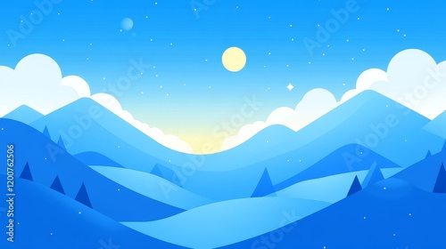 blue, mountain, river, dawn, sky, cloud, sun, moon, star, serene, peaceful, calm, tranquil, landscape, nature, scenery, hill, vale, water, light, morning, sunrise, artistic, illustration, digital, art, painting, design, graphic, style, minimalist, simple, smooth, colours, shades, hue, pastel, soft, gentle, dreamy, magical, fantasy, wonder, beauty, view, vista, horizon