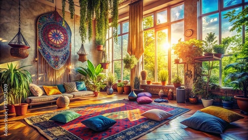 meditation, bohemian, eclectic, room, interior, serene, peaceful, calm, yoga, mindfulness, spirituality, relaxation, zen, home decor, textile, plant, sunlight, window, macrame, cushion, rug, vibrant, colourful, panoramic, photo, space, atmosphere, tranquil, harmony, well-being, spiritual, inner peace, balance, comfort, sanctuary, refuge, stillness, quiet, contemplation, introspection