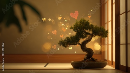 Serene Bonsai Tree with Floating Hearts and Soft Bokeh in Tranquil Indoor Space