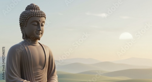 Serene Buddha Statue at Sunrise Over Rolling Hills Peaceful Meditation in Nature