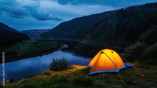 camping, tent, river, mountain, twilight, nature, landscape, adventure, serenity, orange, illumination, scenic, leisure, travel, calmness, grass, scenic view, peaceful, environment, hiking, wilderness, sunset, exploration, calm, remote, sky, night, glow, water, tree, summer, quiet, journey, relaxation, get-away, solitude, picturesque, terrain, atmosphere, vibrant, dark, evening, natural, edge