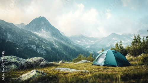 serene camping scene in mountains with green tent, surrounded by lush greenery and rocky terrain. majestic peaks create peaceful atmosphere for outdoor enthusiasts