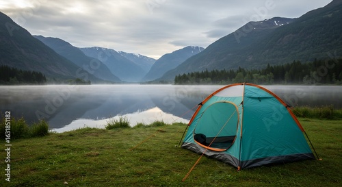 camping, tent, nature, landscape, lake, mountain, water, travel, adventure, scenic, calm, serene, misty, fog, sunrise, sunset, morning, evening, tree, green, grass, calmness, peaceful, exploration, wilderness, vacation, tour tourism, nature scene, scenic view, mountain chain, outdoors, natural beauty, cloud, sky, recreational activity, campground, relaxation, dawn, travel destination, environment, summer, vale