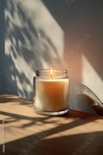 Serene Candlelight - Glass Jar Candle with Soft Sunlight and Open Book.