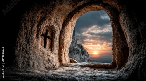 Serene Cave Entrance Revealing Stunning Sunset Over Mountainscape