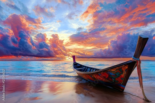 Serene Coastal Landscape with Colorful Boat at Sunset, Vibrant Clouds Reflecting on Calm Water, Peaceful Seascape in Tropical Paradise