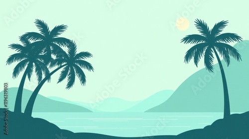 Serene Coastal Vista Twin Palm Trees Frame a Tranquil Ocean Scene with Gentle Rolling Hills Under a Calm Sky