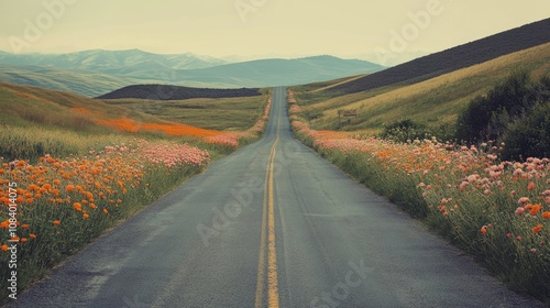 road, wildflower, nature, landscape, scenery, travel, field, orange, pink, green, horizon, sky, mountain, winding, rural, spring, summer, floral, blossom, peaceful, vibrant, countryside, adventure, journey, empty, scenic, beautiful, tranquil, path, sunlight, bloom, flower petals, environment, flower, natural, idylli, relax, beauty, meandering, fresh, daylight, view, picturesque, elevation, clear