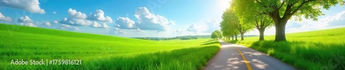Serene country road winds through lush green fields under a vibrant blue sky, trees lining the way, sunlight dappling the path Perfect for travel, nature, and idyllic themes , journey, adventure