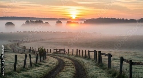 sunrise, mist, fog, countryside, rural, landscape, dawn, morning, field, path, dirt, road, horse, animal, fence, wooden, frost, winter, cold, nature, outdoors, scenic, peaceful, calm, serene, pastoral, agriculture, farm, tree, horizon, sky, orange, yellow, light, shadow